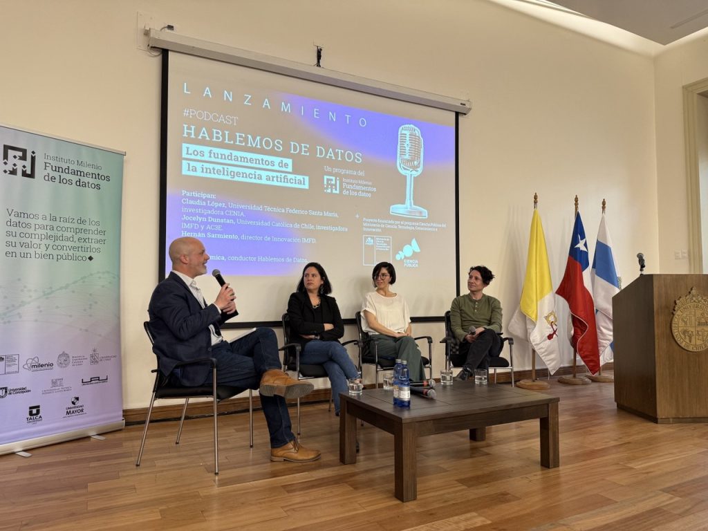Difundir los contenidos basados en ciencia creados en el instituto a localidades de todo el país: ese es uno de los objetivos del nuevo podcast y programa radial Hablemos de Datos, los fundamentos de la inteligencia artificial, que el Instituto Milenio Fundamentos de los Datos (IMFD) acaba de estrenar, con financiamiento del programa Ciencia Pública del Ministerio de Ciencia, Tecnología, Conocimiento e Innovación.  Para la académica IMC-DCC UC, Jocelyn Dunstan Escudero, directora académica del proyecto, “Hablemos de Datos busca democratizar el conocimiento de una manera amena y cercana. Buscamos estar en todas las plataformas de escucha, pero también en radios locales de Arica a Porvenir. Para mi es común aprender de podcasts en inglés, o discutiendo en clases con mis alumnos y alumnas del curso de inteligencia artificial, pero creo profundamente en el valor de dejar el conocimiento abierto a la población”, destaca. “En el IMFD, decidimos que la crisis de medios podría ser una oportunidad. Y es así como empezamos a trabajar con los podcasts, un formato que nos permite compartir los conocimientos con nuestras audiencias. En este proyecto, el empuje que nos da el programa Ciencia Pública nos está permitiendo llegar mucho más allá, gracias a una serie de convenios con radios locales”, explicó Paula Mónica Silva, directora del proyecto, en el foro realizado en el lanzamiento. En el conversatorio, los y las participantes compartieron sobre los desafíos que ofrece la ciencia de datos y la inteligencia artificial para nuestro país. La actividad contó con la presencia de la académica del IMC-DCC UC Jocelyn Dunstan Escudero, conductora del podcast y directora académica del proyecto; Davor Mimica, conductor del programa; la académica de la Universidad Técnica Federico Santa María, Claudia López; y Hernán Sarmiento, director del área de Innovación del IMFD.  El podcast contará con 10 capítulos en los que se abordará cómo la ciencia de datos y la inteligencia artificial están cambiando sectores y áreas de trabajo en nuestro país, como la salud, educación, el arte, las comunicaciones, la sostenibilidad, entre otros. “Partimos situando qué es la ciencia de datos y la inteligencia artificial para luego hablar con la profesora de la Universidad Federico Santa María Claudia López acerca de la inteligencia artificial centrada en las personas y el nivel de confianza de la población en ella. Como cada capítulo, termina con una reflexión de lo conversado”.  El podcast ya tiene su primer episodio disponible en hablemosdedatos.cl y desde la siguiente semana, saldrá al aire por las radios locales:  Vilas Radio – Iquique y el interior de la región de TarapacáRadio Siete – Antofagasta y CalamaRadio Universidad de AntofagastaRadio Estrella del Norte – Vallenar y provincia del HuascoRadio América – La Serena y CoquimboRadio Universidad Católica de ValparaísoRadio Super Andina – San Felipe, Los Andes y la provincia de Los Andes Radio Integración – San Antonio y el Litoral CentralRadio Trigal – Santa Cruz y la provincia del CachapoalRadio Ritmo – Rancagua y la provincia de Colchagua Radio Morena – Chillán, San Carlos y toda la provincia de Punilla, Radio Sago – Osorno, Región de Los Ríos y Los Lagos, Radio Apocalipsis – Cochrane, Coyhaique, Puerto Aysén y Chacabuco, Radio Magallanes – Punta Arenas y Porvenir Para más información, puedes escribir a hablemosdedatos@imfd.cl  Video del lanzamiento, disponible en: https://youtu.be/0w7r2WjrAx8 Reproduce los episodios en: www.hablemosdedatos.cl  Sigue las redes del IMFD en:Instagram: @fundamentosdelosdatosLinkedin: Instituto Milenio Fundamentos de los DatosX: @IMFDChileBluesky: @imfdchile.bsky.socialYoutube: @FundamentosdelosDatos