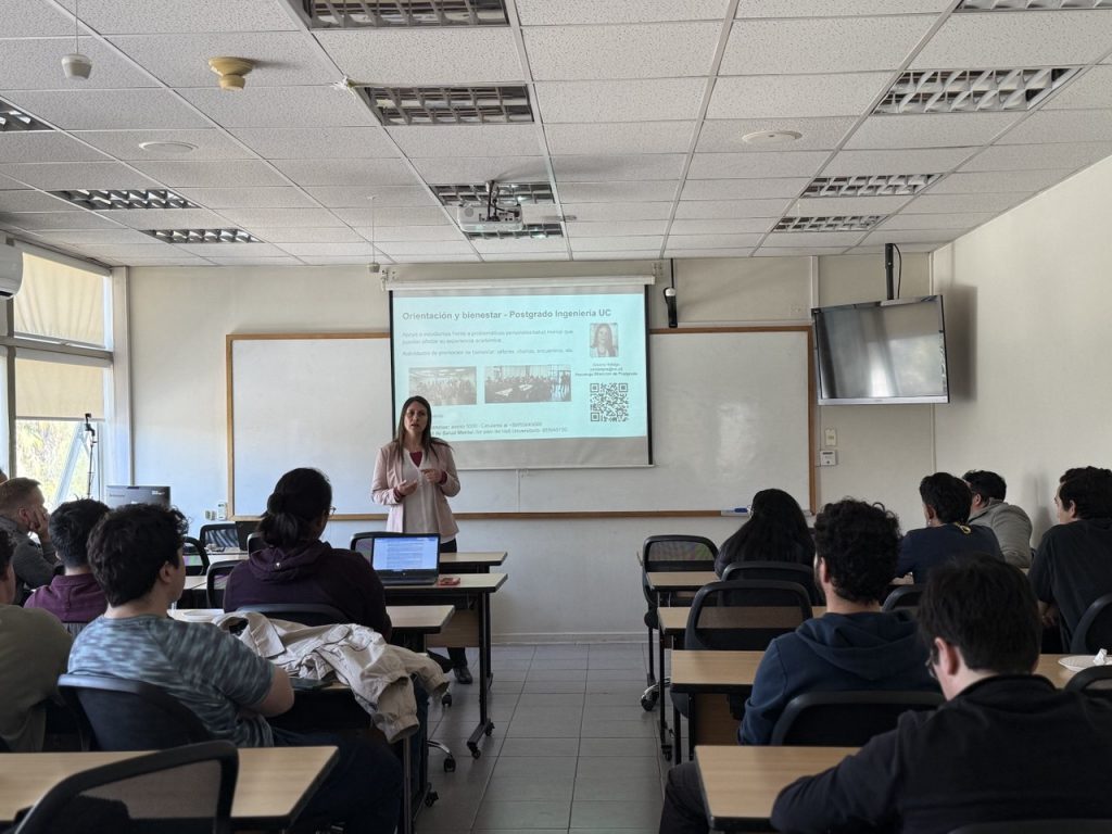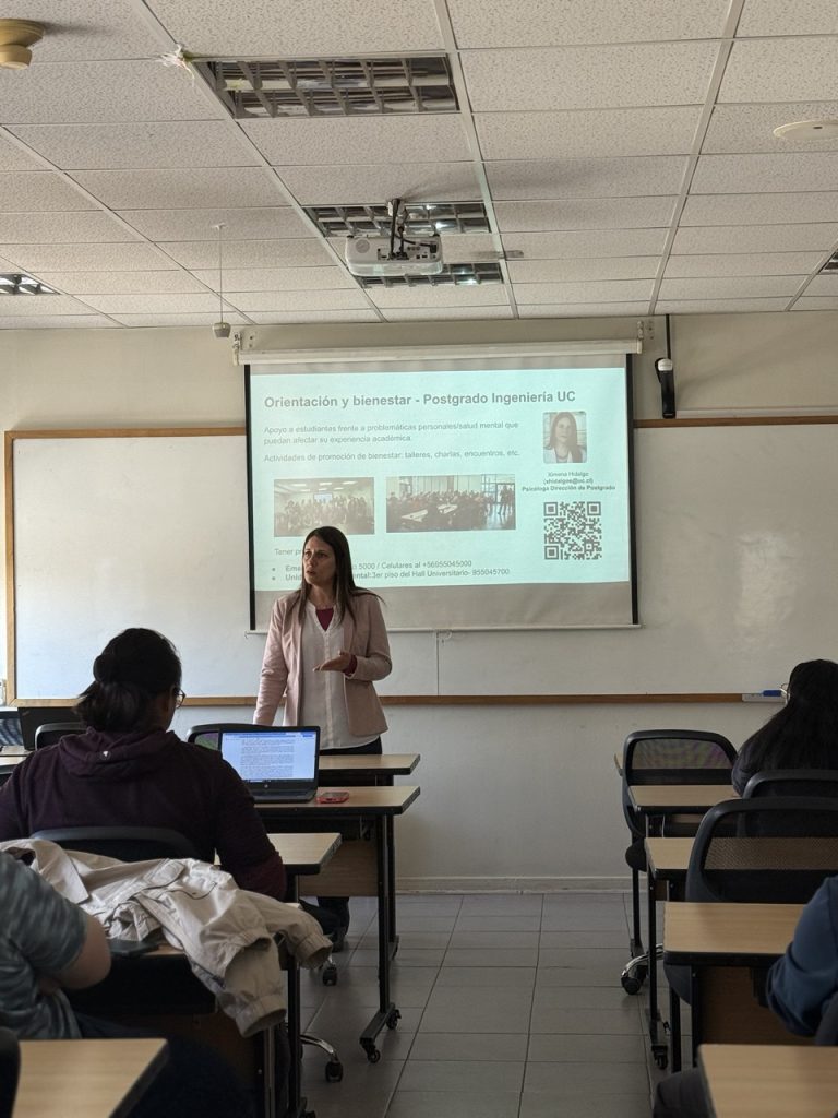 Con el fin de alinear y enfatizar en el bienestar de los estudiantes, se presentó Ximena Hidalgo, psicóloga de postgrado con un trascendente rol, pues mostró las distintas vías de apoyo que tiene Postgrado ING UC para estudiantes, recalcando la importancia del Bienestar y la Salud Mental.